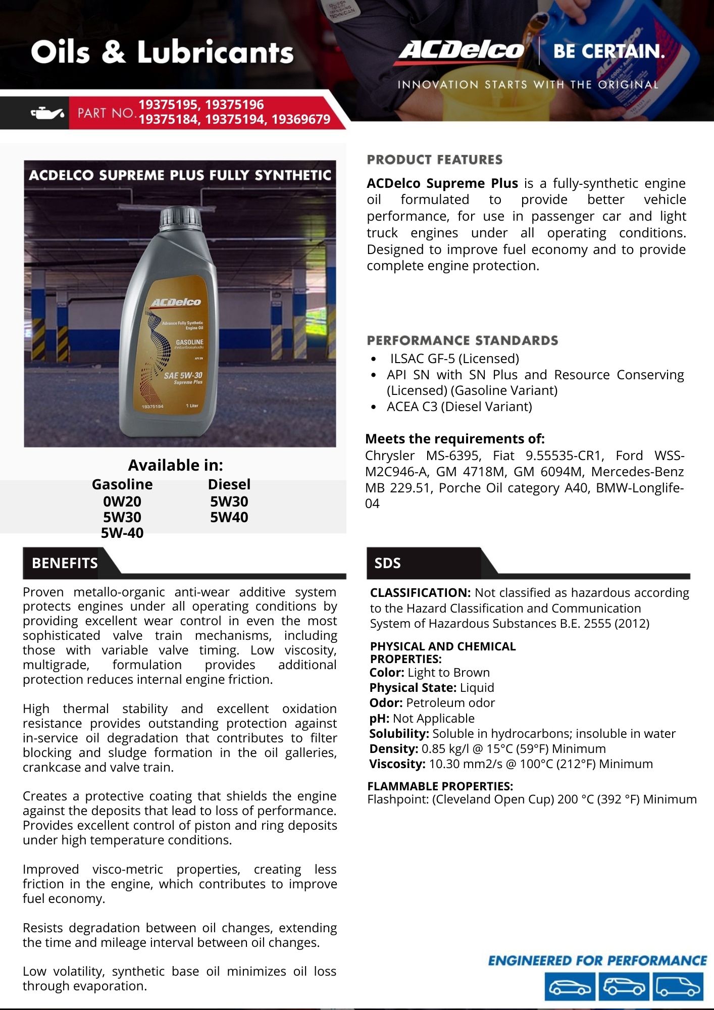 ACDelco Fully Synthetic Engine Oils are designed with high-quality synthetic base stocks and top-of-the-line additive technology to provide maximum protection for today’s modern engines. They meet common US and European industry standards like ILSAC GF-6 and API SP Service Classification, and are formulated to meet the common warranty requirements for U.S., European, and Japanese cars and light trucks with gasoline engines. It is recommended for use in cars and light trucks with gasoline and gasoline turbocharged engines where API SP and all prior specifications are required.